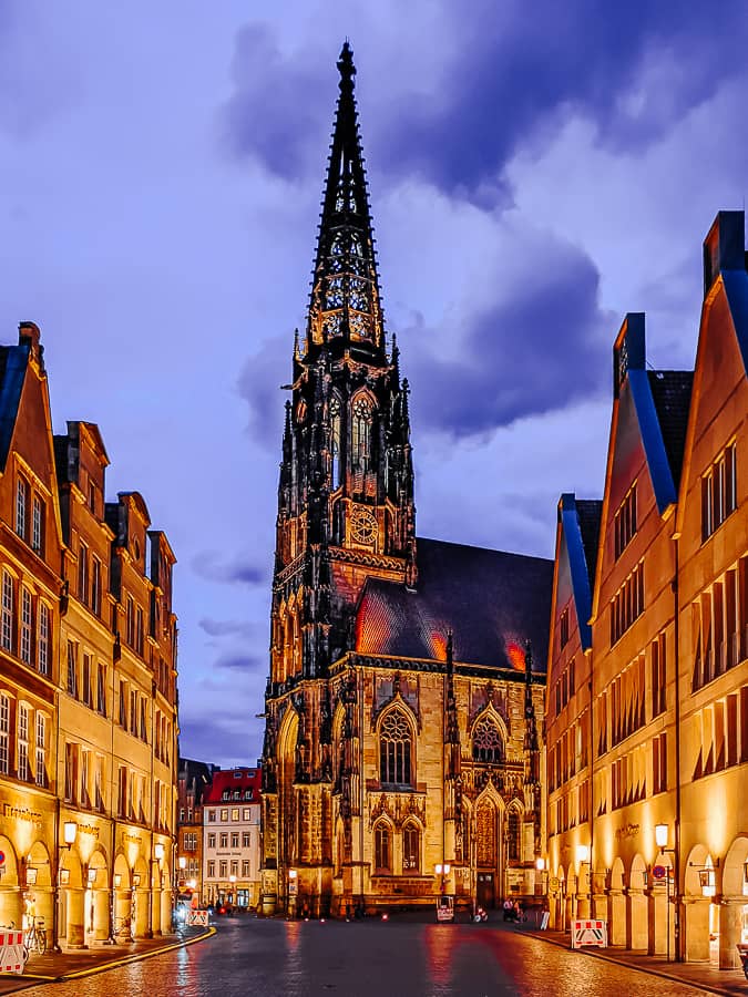 Ebenfalls am Prinzipalmarkt, genauer gesagt dort, wo Roggenmarkt und Alter Fischmarkt in den Prinzipalmarkt münden, findest du die St. Lambertikirche Münster. Sie gilt als Markt- und Stadtkirche Münsters und ist eine katholische Kirche. Gebaut wurde sie zwischen Mitte des 14. Jahrhunderts und Mitte des 15. Jahrhunderts.