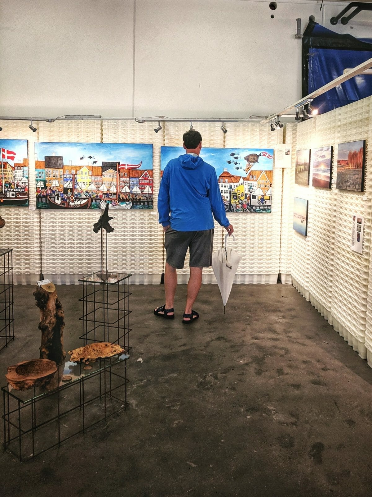 Anschließend machen wir noch einen kurzen Spaziergang durch den Ort (gut, dass das Hotel Regenschirme hat) und entdecken dabei eine kleine Galerie im Hafen. Hier werden zwischen alten Fischkisten Bilder und Werke von verschiedenen dänischen Künstlern ausgestellt. Irgendwann beschließen wir, uns auf den Weg zum Hotel zu machen und unsere zweite Etappe, trotz weiterhin schlechten Wetters anzutreten. Zumindest hat es vorübergehend aufgehört zu regen. Wir haben unsere Regenbekleidung trotzdem griffbereit.