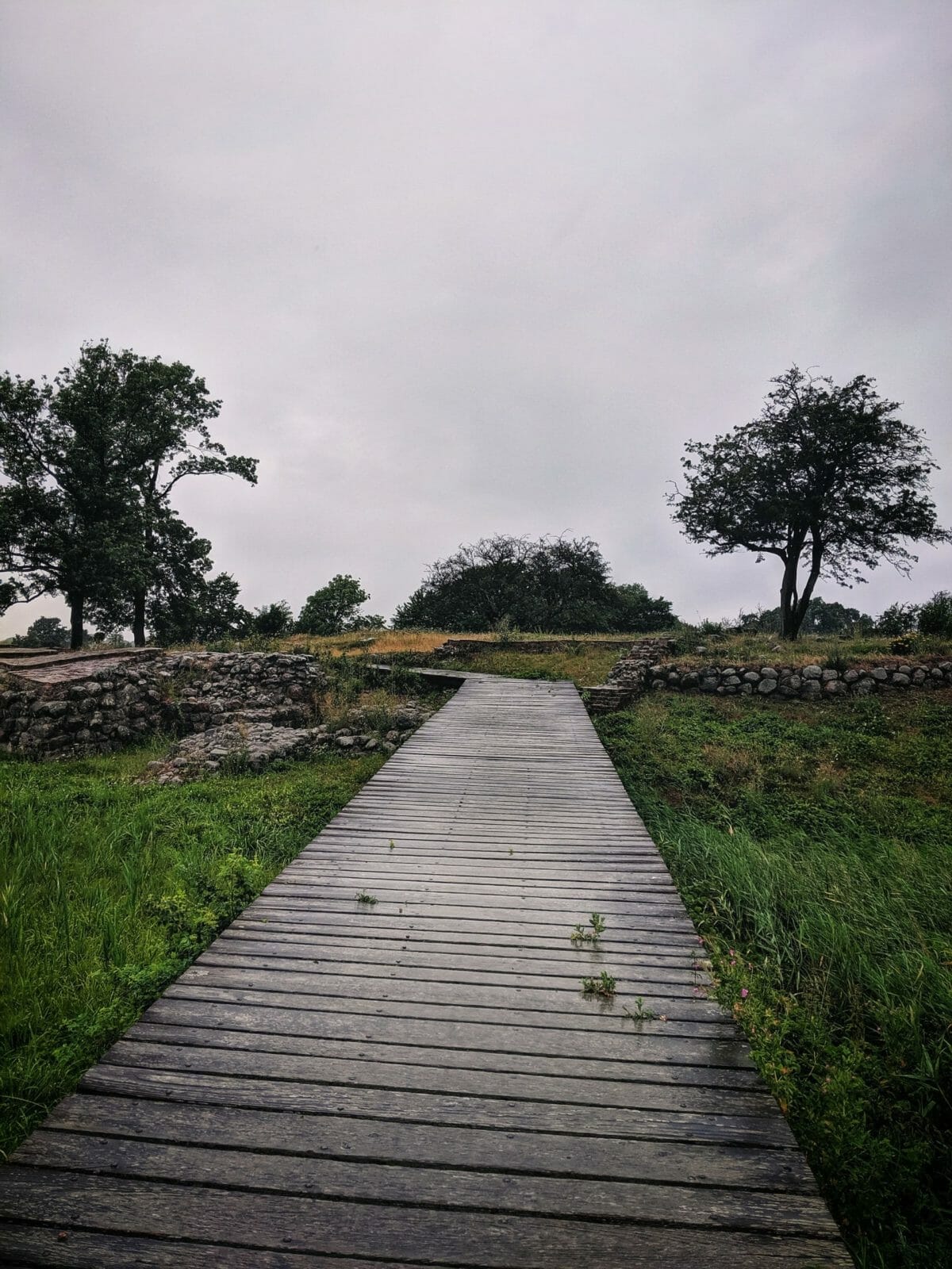 Unser erster Stopp war bereits nach ca. vier Kilometern eingeplant: die Schlossruine von Søborg. Es ist leider nicht mehr viel zu sehen von dem einstigen Schloss, nur noch ein paar Grundmauern sowie der Steg zum Eingangstor. Es fordert schon viel Vorstellungsvermögen, um sich hier ein Schloss auszumalen. Lässt man den Blick ein wenig schweifen, weiß man aber sofort, warum hier mal ein Schloss stand. Die Aussicht auf das weite Land und die umliegenden Wälder ist wirklich schön. Auch wenn der Nieselregen und der wolkenverhangene Himmel versuchen, uns die Stimmung zu vermiesen – keine Chance! 😉