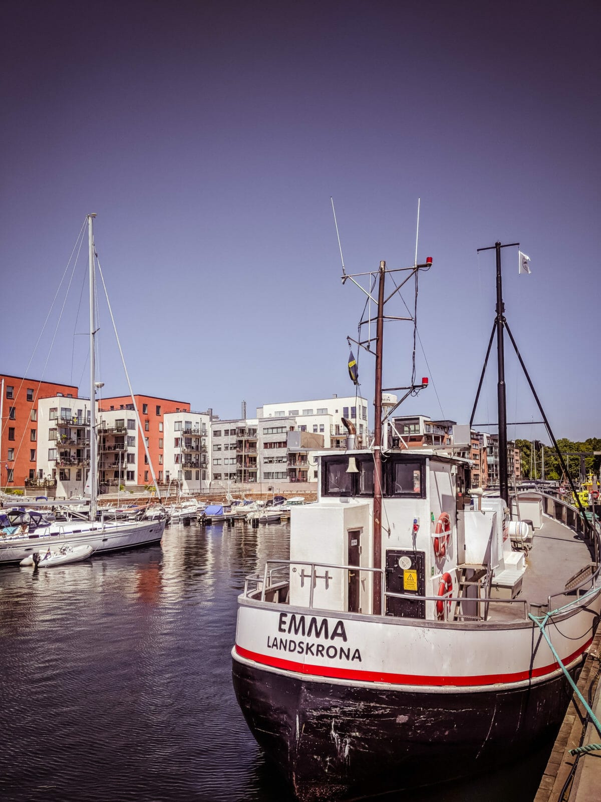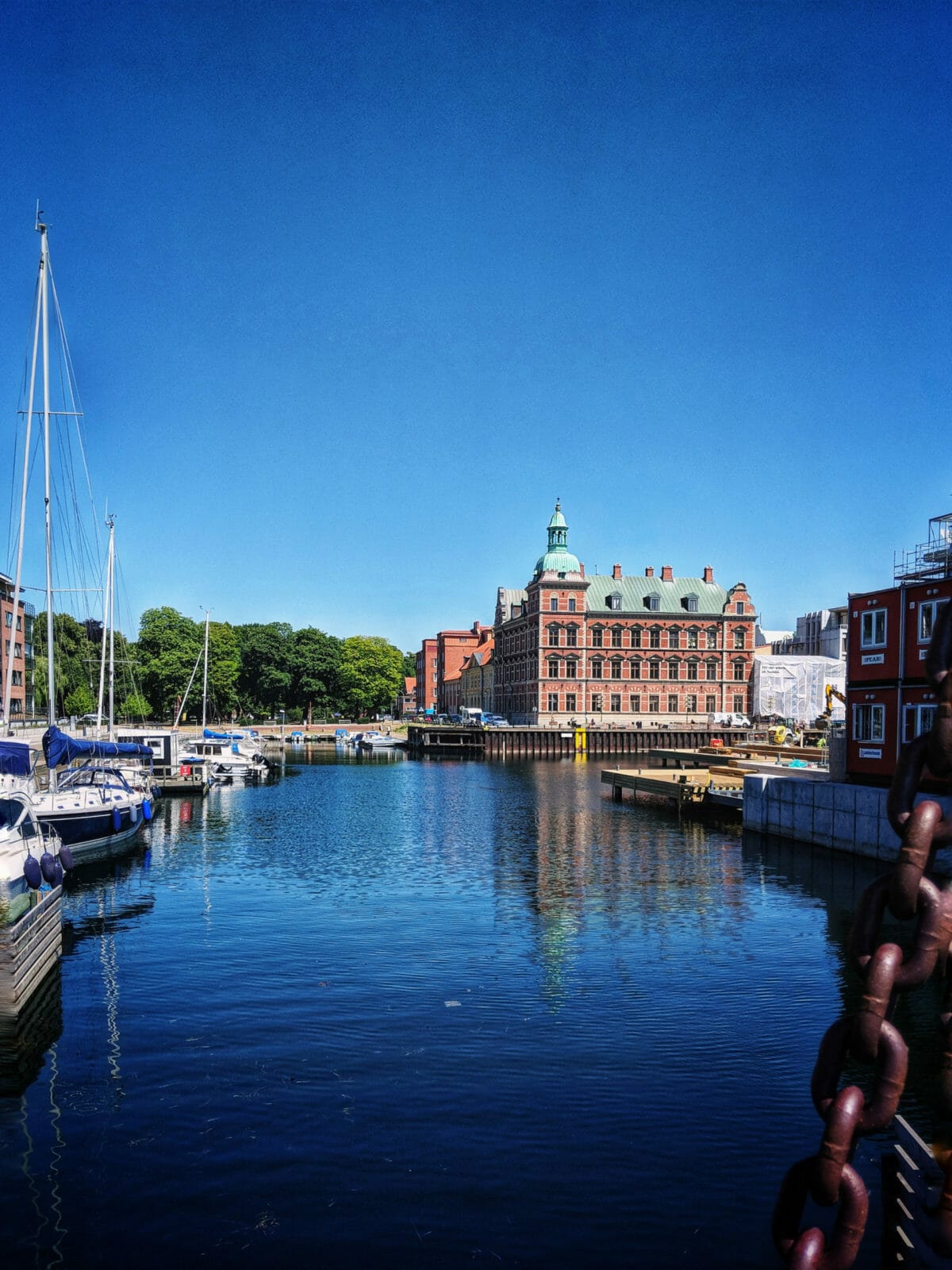 Unsere erste Station in Skåne ist die Stadt Landskrona. Wir brauchen dringend Kaffee und Oliver auch schwedische Kanelbullar (Zimtschnecken). Also in die nächste Bäckerei, Kaffee und Zimtschnecke kaufen. Wie gut, dass man in Schweden so gut wie überall mit Kreditkarte bezahlen kann, Bargeld benötigen wir während der gesamten Zeit nicht. Und dann ab zum nahegelegenen Hafen um die Aussicht bei Kaffee und Zimtschnecke zu genießen. Hallo Urlaubsfeeling.