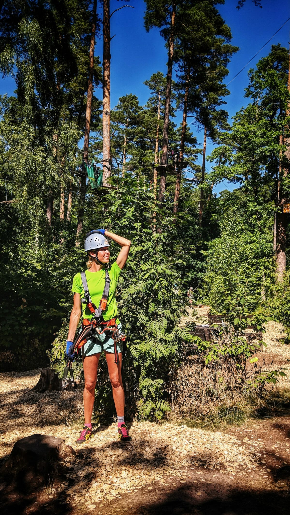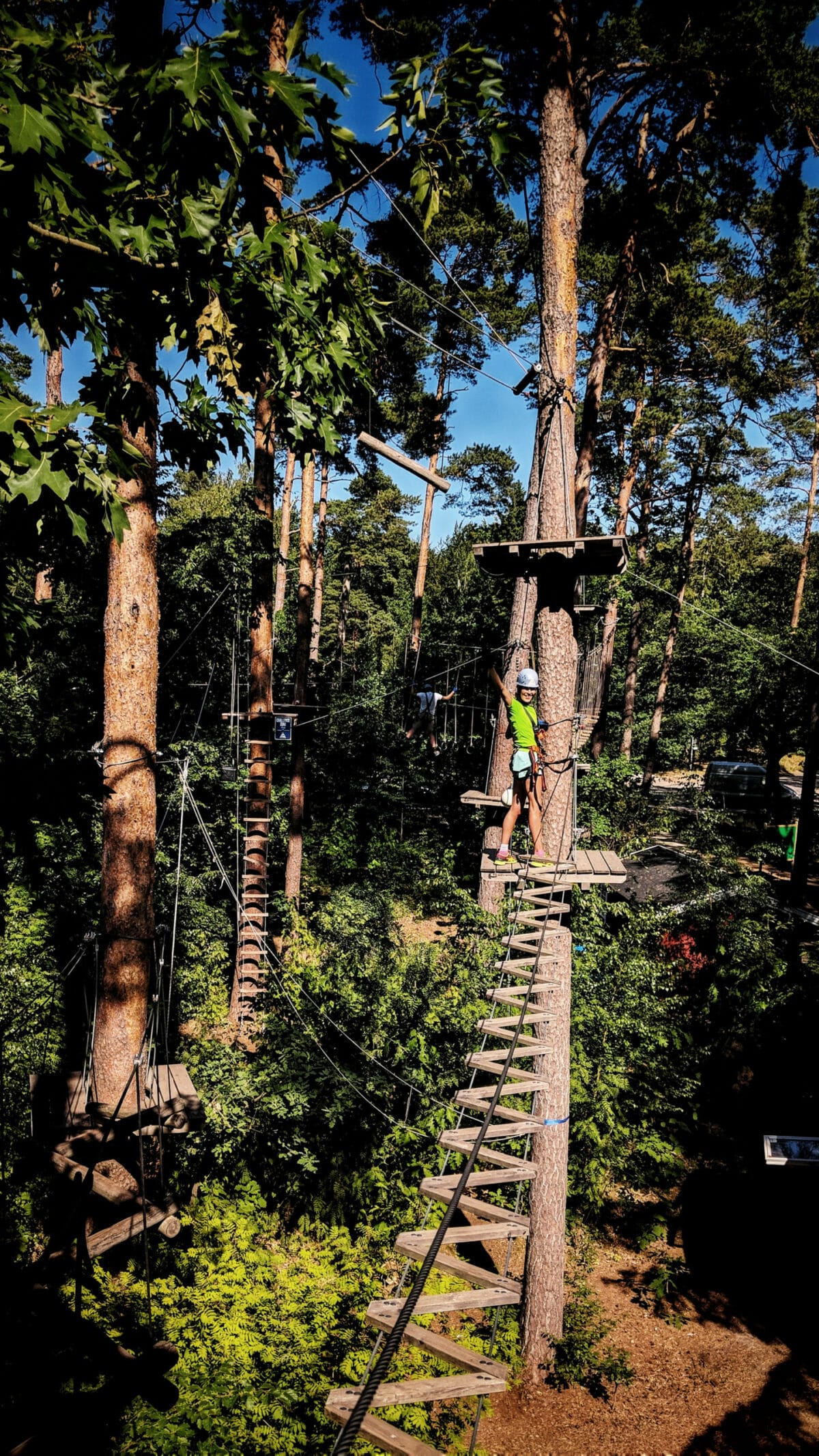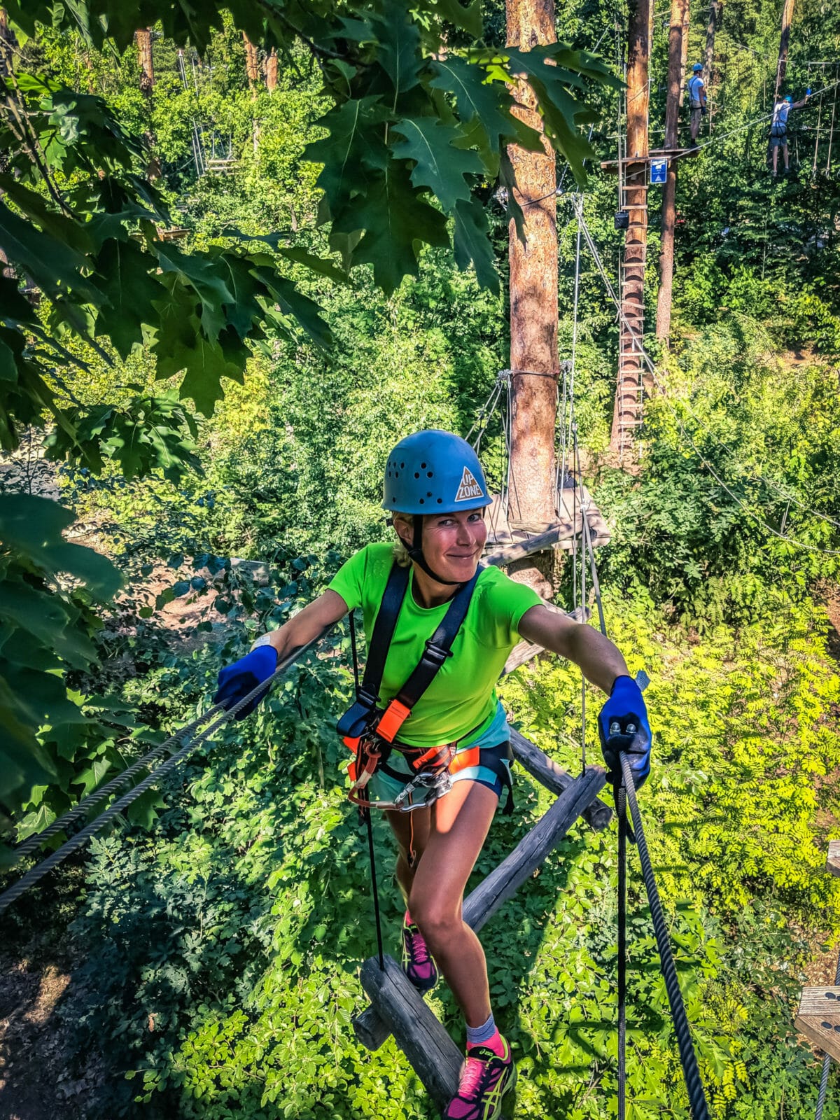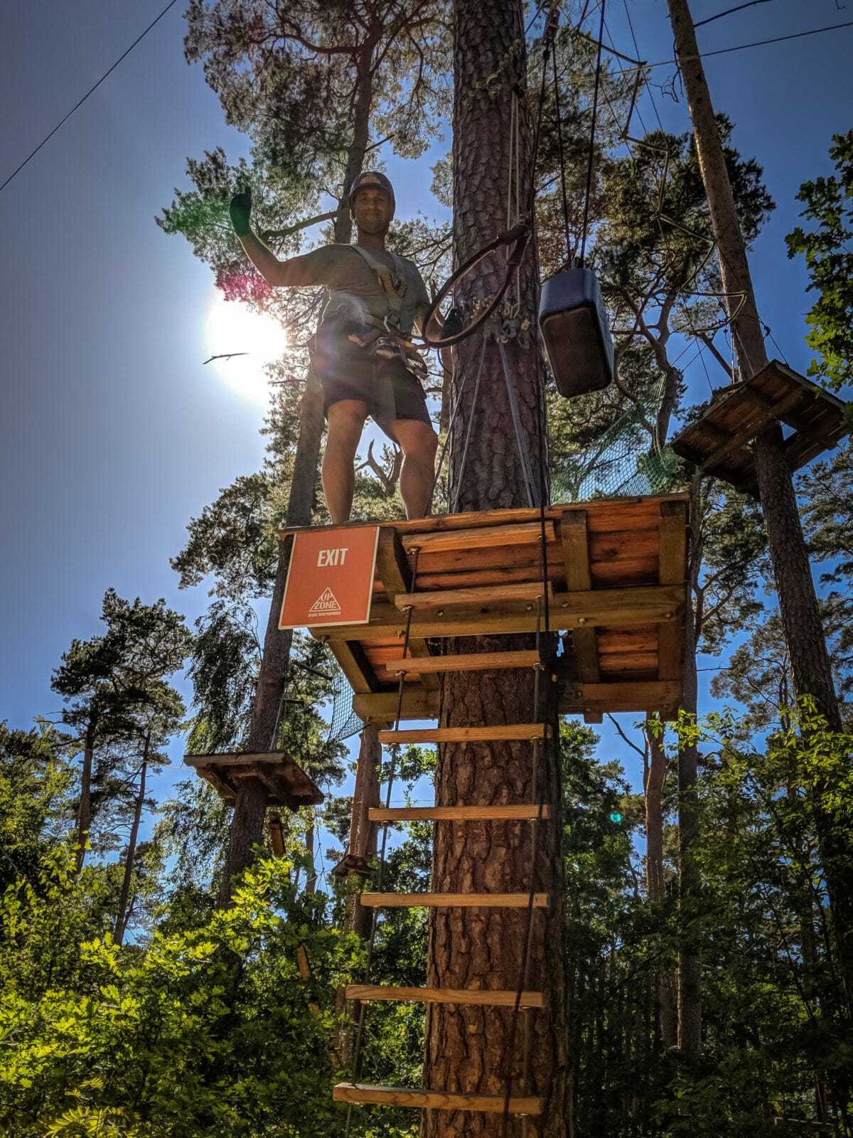 Im Kletterpark angekommen, gibt es eine ausführliche Sicherheitseinweisung, der Parcours mit seinen Strecken wird vorgestellt und wir lernen, wie wir richtig mit der Ausrüstung umgehen. Dann warten auch schon 5 verschiedene Strecken mit unterschiedlichem Schwierigkeitsgrad auf uns. Sollen wir mit der „Riskzone“ beginnen? Oder vielleicht lieber „Adventure Zone“. Wir beschließen, langsam loszulegen und uns dann im Schwierigkeitsgrad zu steigern. So beginnen wir mit der leichteren gelben Strecke, die sehr zu unserem Vergnügen eine Menge an Ziplines, bei denen wir zwischen den Bäumen hindurchrasen, beinhaltet.