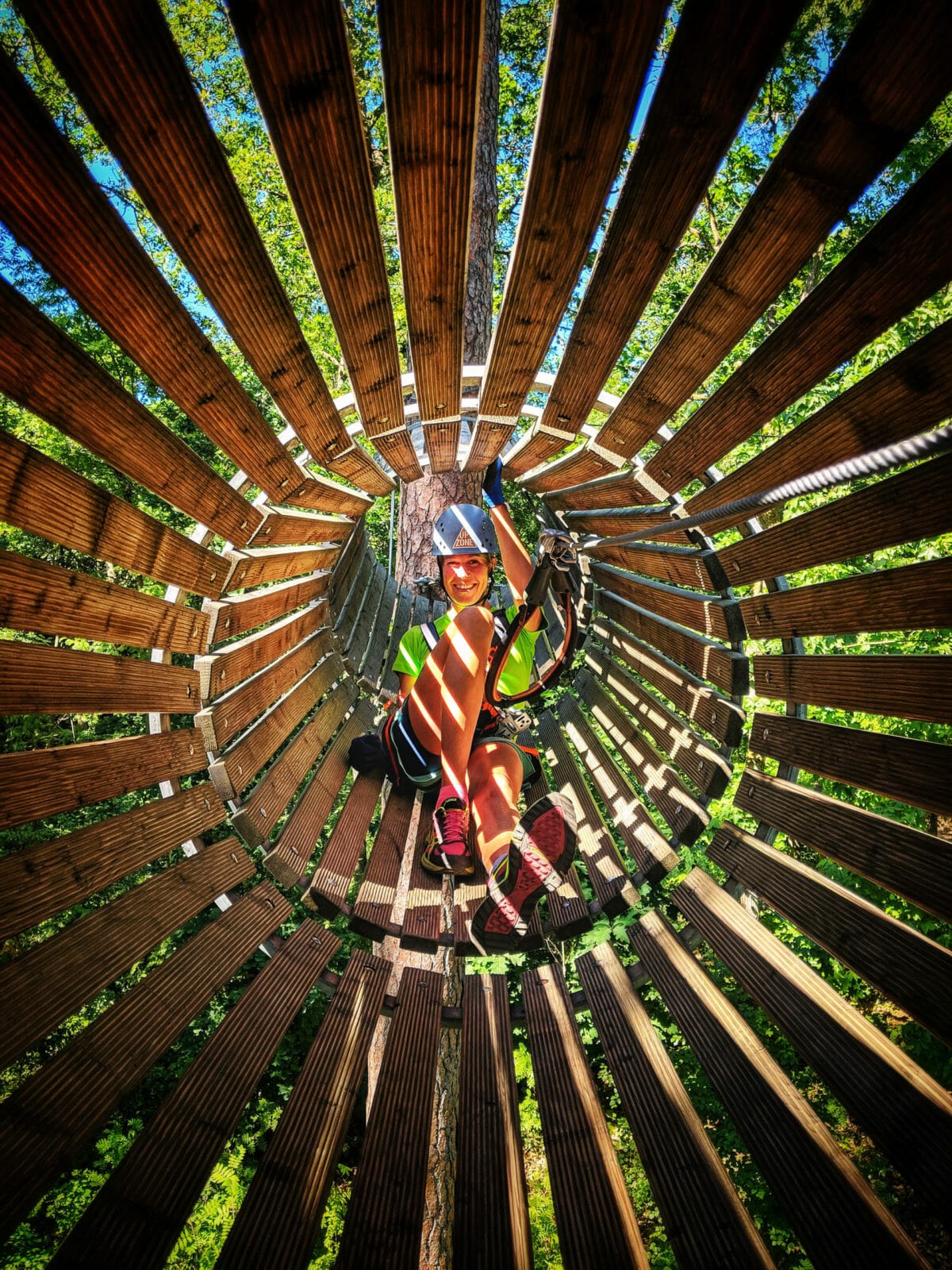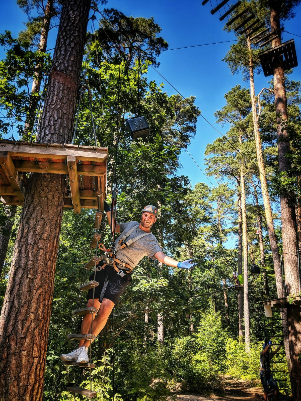 YEAH! Mehr, Bitte! Oliver ist in seinem Element, Judith ein bisschen weniger, aber als Team ist die Strecke für uns keine Herausforderung. Also auf geht es zur nächsten Strecke. Weitere Hindernisse und sogar ein Schlitten (wann ist wieder Weihnachten?). Mehr YEAHs. Was ein Spaß. Für Menschen mit Höhenangst sind die Strecken aber eine echte Herausforderung. Zweite Strecke geschafft. Jetzt sind wir im Kletterfieber. Los, jetzt die sogenannte „Workout“ Strecke. Da heißt es auf einen Ball zu springen und zu fliegen… Und noch mehr Ziplines! Noch mehr Spaß. Dritte Strecke fertig.