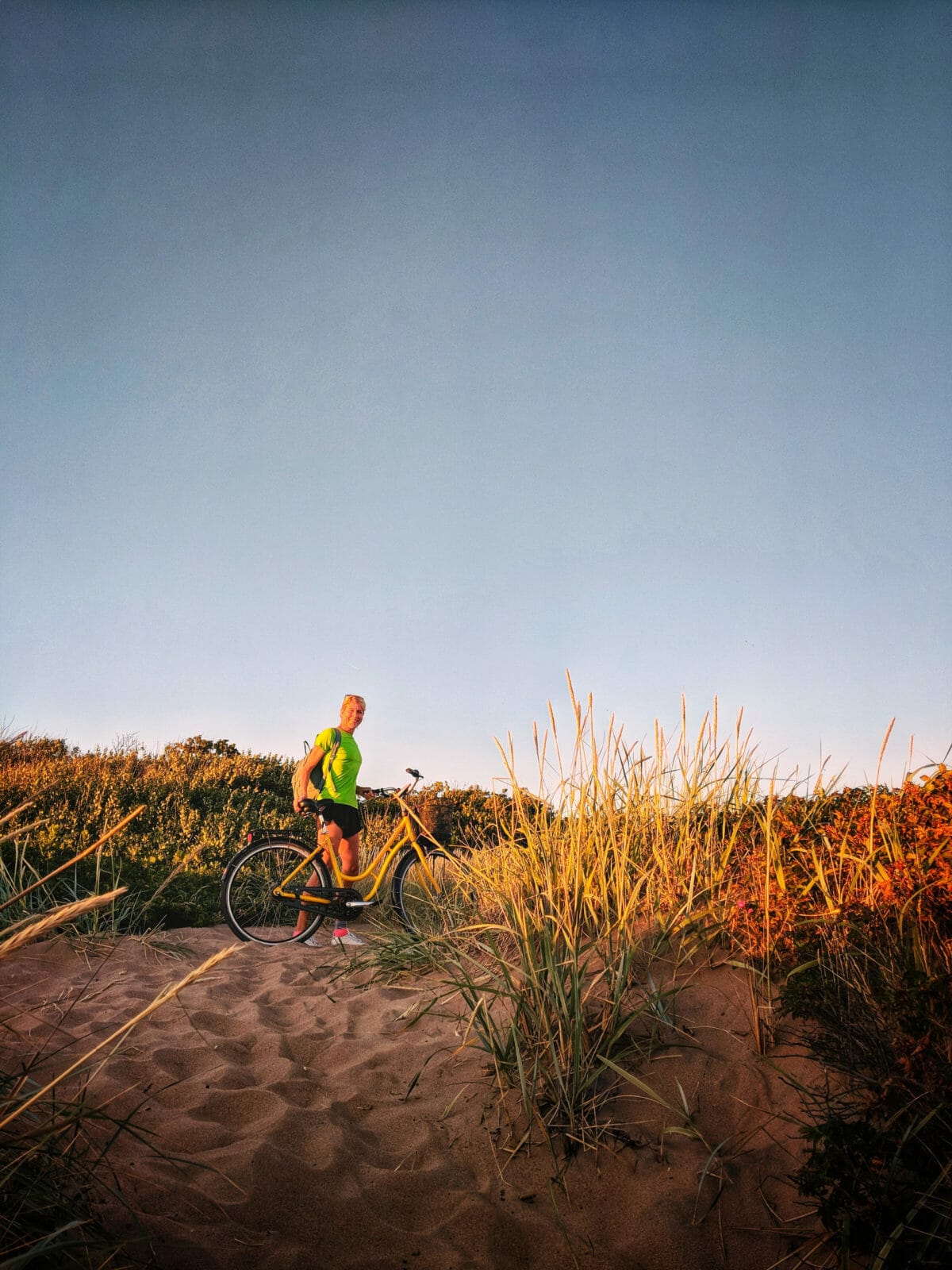 Der Sonnenuntergang ist in Südschweden zu dieser Jahreszeit nicht vor 22:00 Uhr. Uns strahlen zwei gelbe Leihräder vom Hofeingang aus an und wir beschließen eine kurze Radtour zu unternehmen. Wir wollen Vejbystrand erkunden und einen hoffentlich schönen Sonnenuntergang am Strand auskosten. Gute Entscheidung, das Licht ist perfekt. Auch für einige schnelle Fotos. Weiches, goldenes Licht und angenehme Temperaturen. Ein perfekter Abschluss für unseren ersten Tag in Skåne.