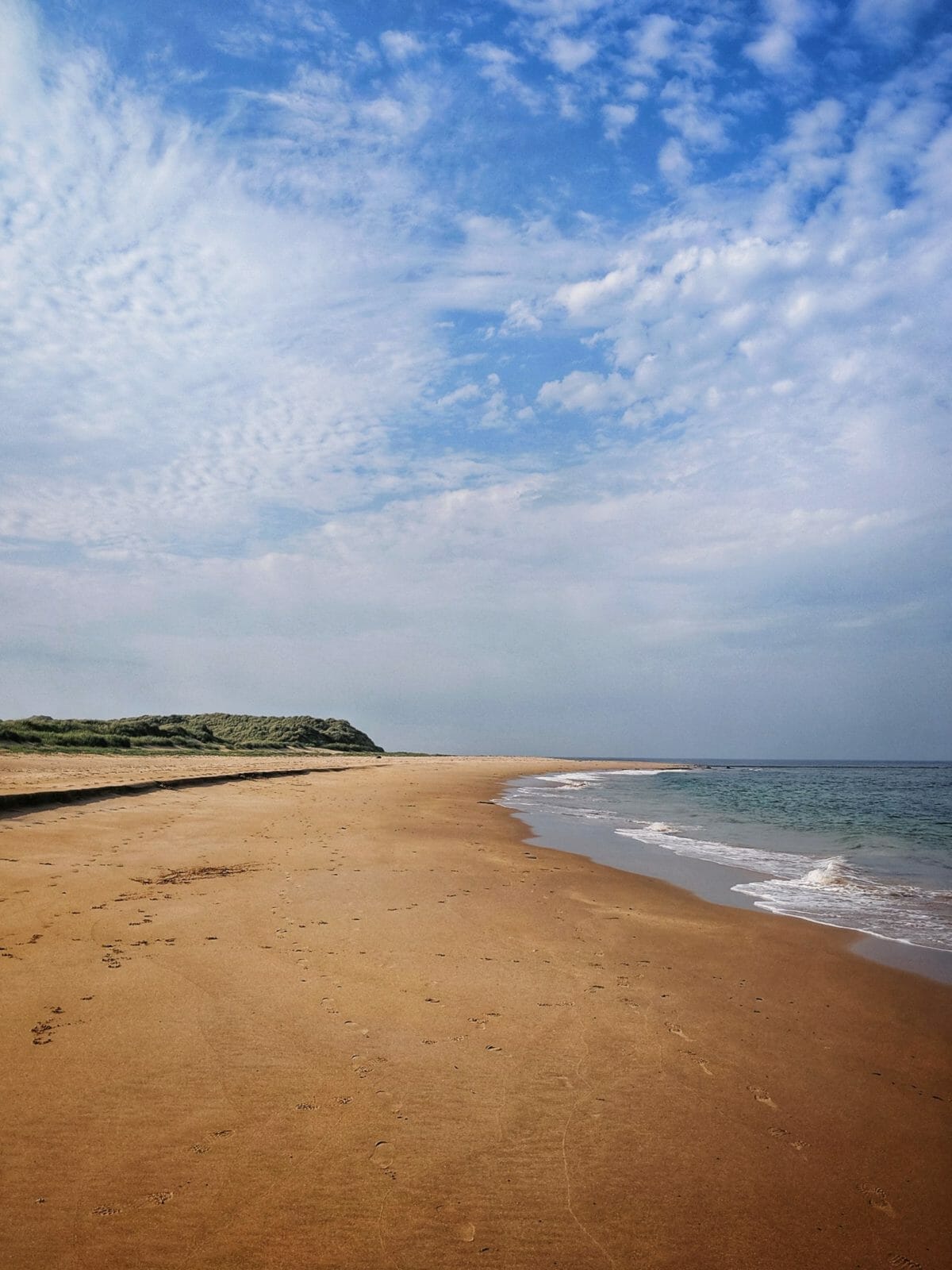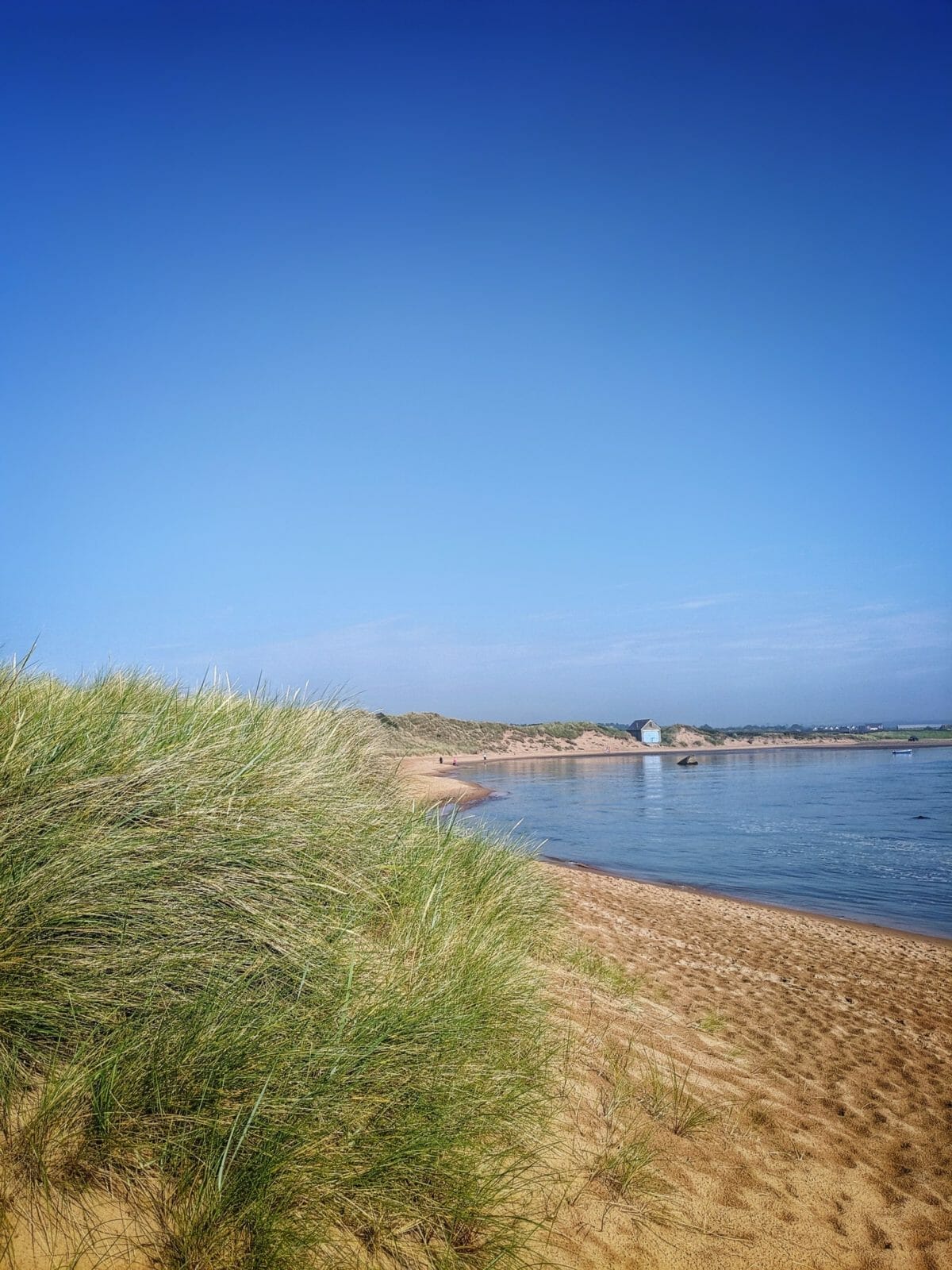 Wir erreichen den Strand am immer noch frühen Morgen und sind, abgesehen von einem Fischer, die einzigen hier. Der Strand befindet sich an der Flussmündung des Ythan, geschützt in einer Bucht. Hier ist es total ruhig, man hört die Vögel zwitschern und die leichte Brise durch das Gras in den Dünen wehen. Auf der anderen Seite des Flusses liegen hunderte von Seehunden am Strand. Auch im Wasser sieht man die niedlichen Tiere immer wieder mit ihrem Kopf auftauchen. Es fühlt sich an, als sei die Zeit stehen geblieben, und die Entspannung setzt sofort ein.