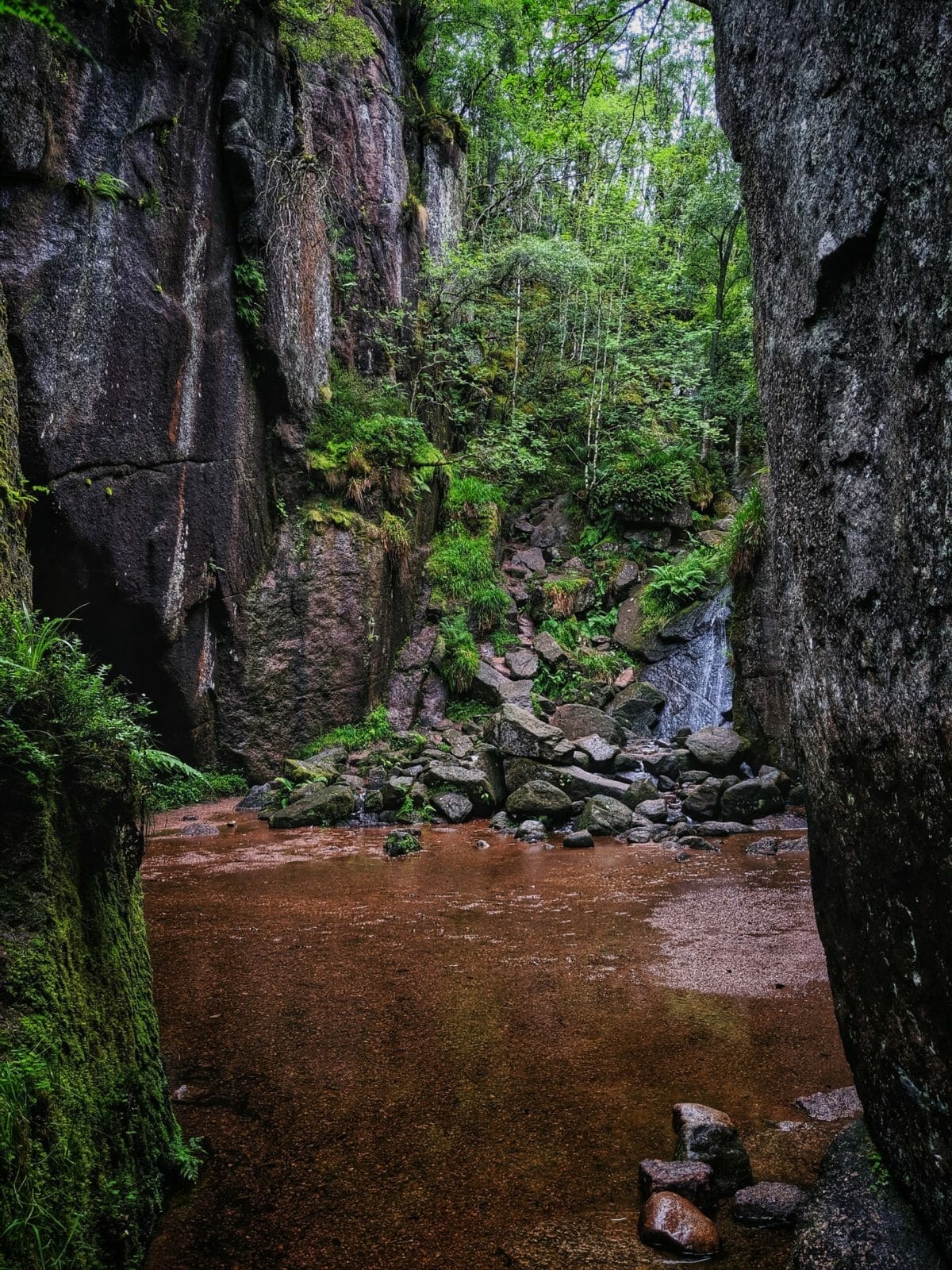 Am besten lässt sich dieses geologische Highlight als eine Art Gletschertopf beschrieben, welcher während der Eiszeit entstanden ist. Um ins Innere des Topfes zu gelangen, müssen wir durch den kleinen Flusslauf waten, welcher sich durch eine Felsspalte hindurch zwängt. Wer keine Angst vor nassen Füßen hat, oder Sandalen trägt, den erwartet innerhalb des Burn O’Vat ein spektakulärer Anblick, Wasserfall inklusive. Wer möchte kann hier auch noch an der Seite des Wasserfalls ein wenig herumklettern.