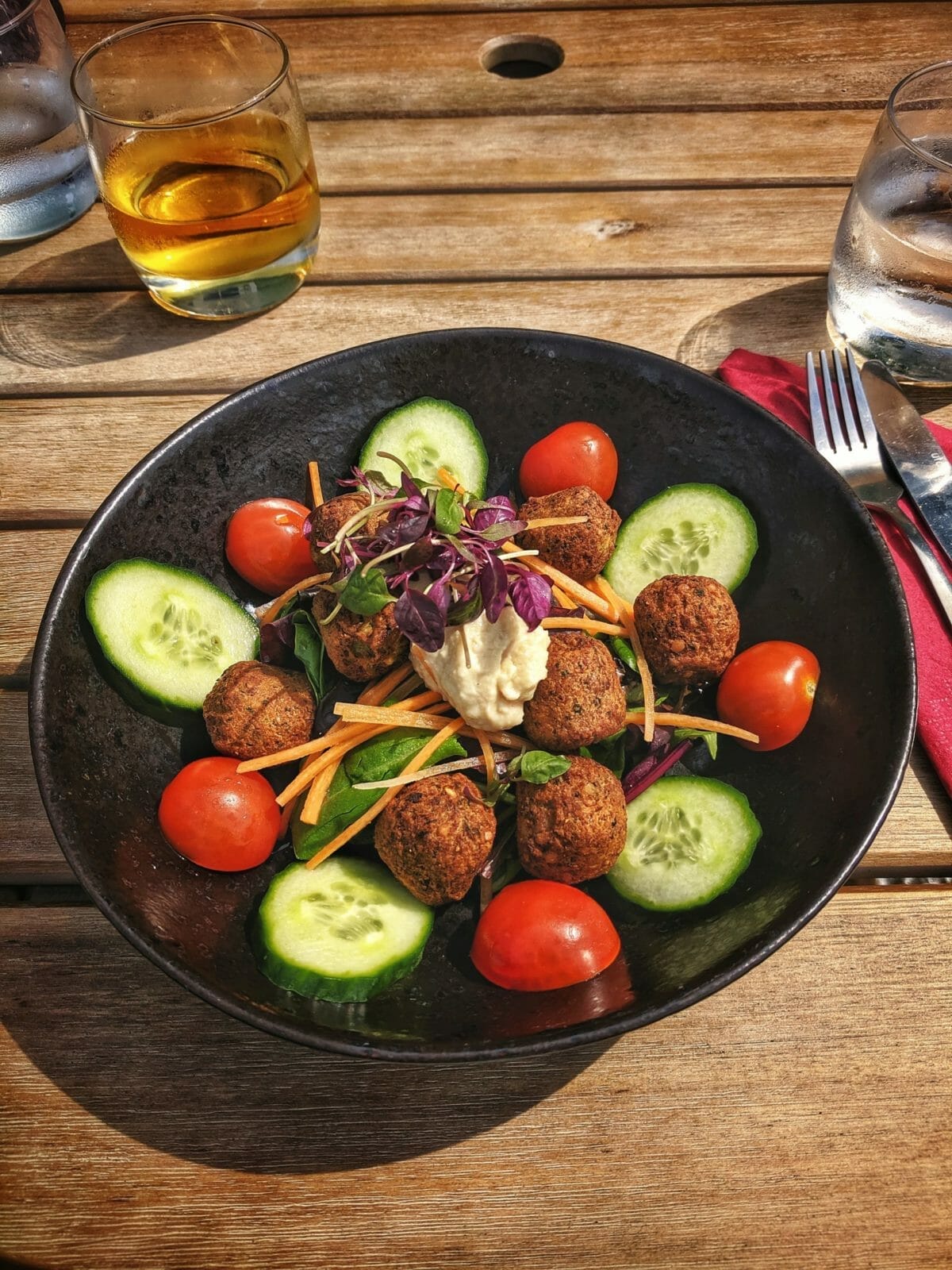 Nach einer kleinen Runde über das Gelände, nehmen wir im angeschlossenen Cafe unser Mittagessen ein. Es gibt auch hier veganes Essen – eine Linsensuppe als Vorspeise sowie einen Falafel-Salat. Außerdem knabbern wir sehr leckere Gemüsechips. Zum Burger gibt's allerdings keine Pommes, denn heißes Fett in einem reinen Holzhaus sei keine gute Idee, sagt uns die Leiterin. Verständlich.