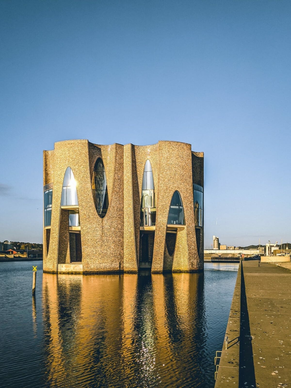 Das Fjordenhus liegt ebenfalls an der Hafenfront von Vejle und soll mit seinen zylindrischen Formen und seiner Lage eine Verbindung zwischen Innenstadt und Hafen schaffen. Und in der Tat, wenn du durch die Einkaufsstraßen bummelst und an der Kirkegade die Straße überquerst, schau doch einmal Richtung Wasser, dort wirst du schon das Fjordenhus in der Ferne entdecken.