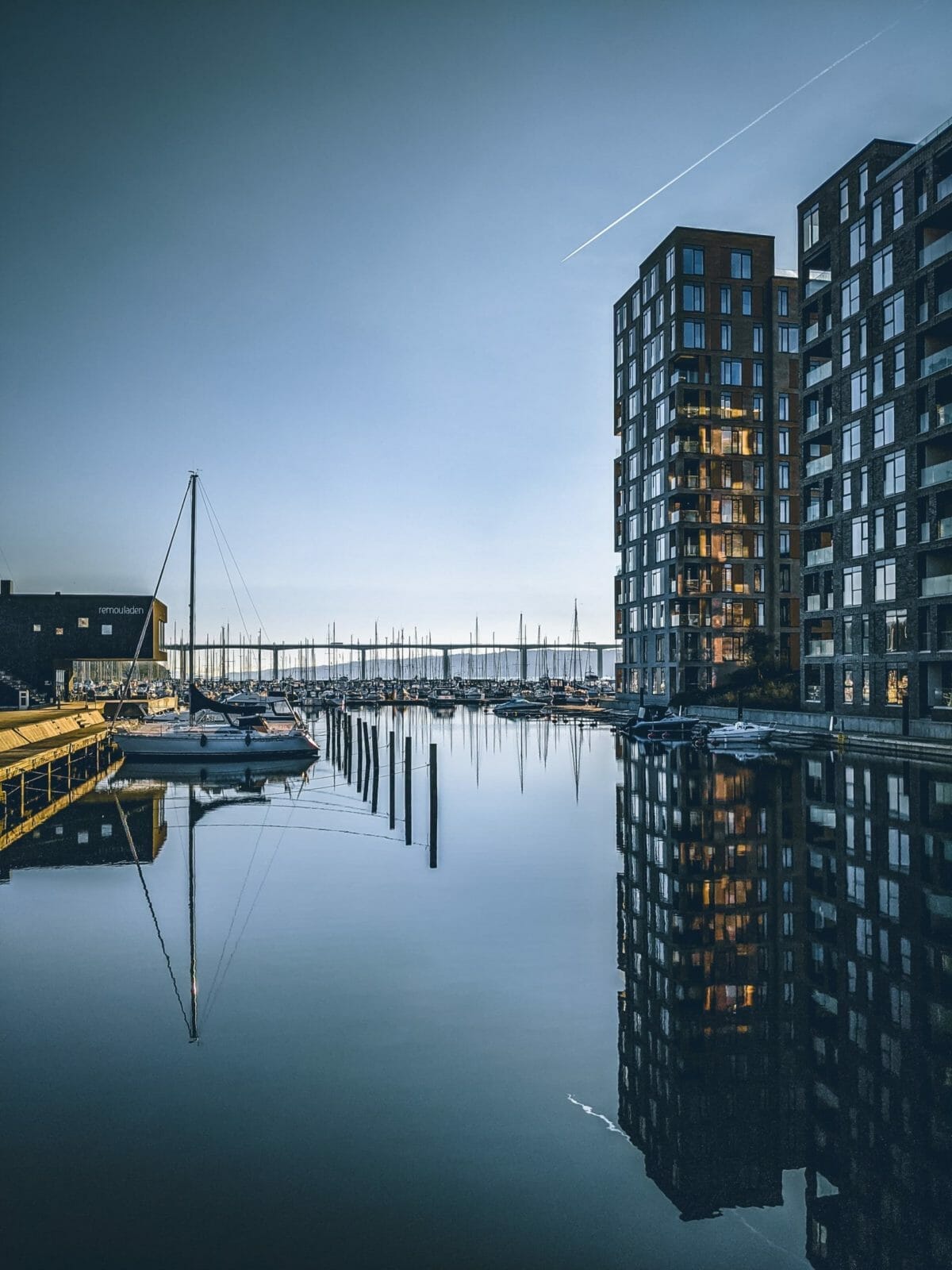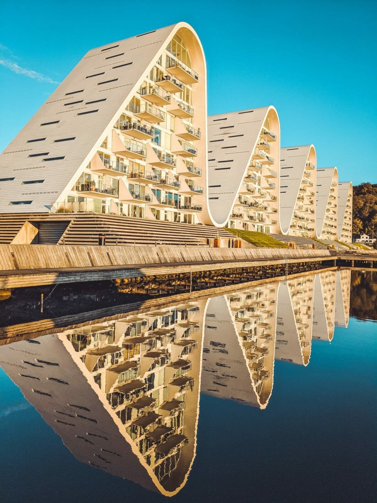 Im Gegensatz zum gemütlichen Zentrum findest du im neu gestalteten Hafen modernste Architektur. Besonders zum Staunen haben uns diese Gebäude gebracht: Das Bølgen-Gebäude, eine moderne Architekturattraktion und ein Wahrzeichen der Stadt, beeindruckt mit seiner einzigartigen Form, seinem innovativen Design und Eleganz.