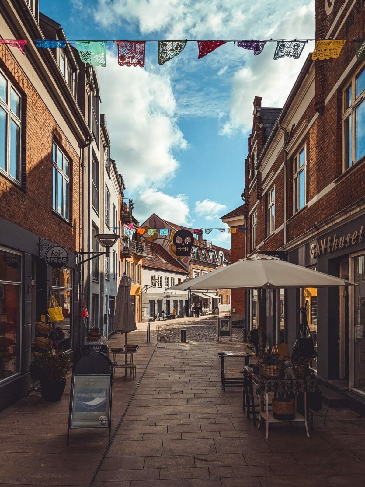 Dieses recht kompakte, kleine Viertel der Stadt, welches auch als Studentenviertel von Vejle bezeichnet wird, beeindruckt vor allem während der Sommermonate mit seiner bunten Regenschirminstallation über den Straßen. Bunt leuchten diese im Sonnenlicht und mit ihrem Tanz hoch oben zwischen den Geschäften ziehen sie einen in den Bann, so dass man gar nicht anders kann, als in das Viertel am Rande der Fußgängerzone einzubiegen.
