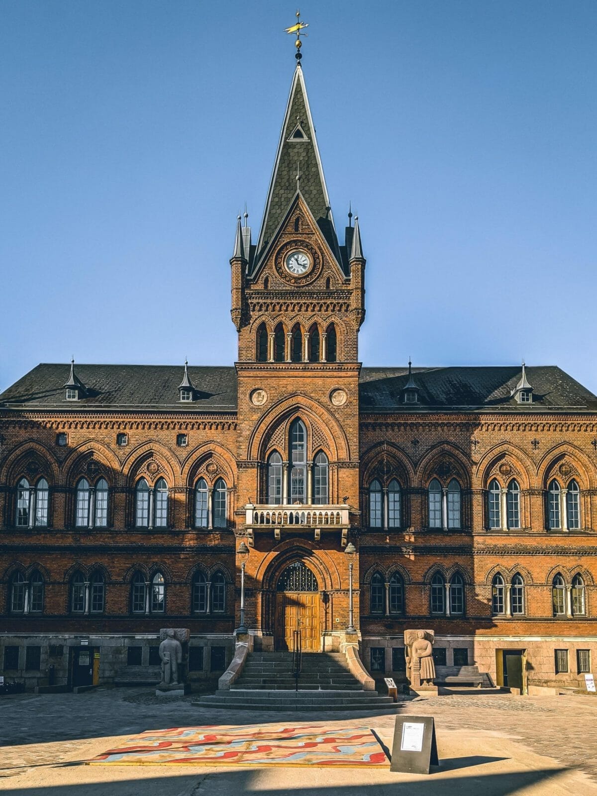 Das heutige Gebäude ist das mittlerweile vierte Rathaus der Stadt, ein beeindruckendes Bauwerk, und wurde 1878-79 erbaut. Das rote Backsteingebäude steht auf dem ehemaligen Grundstück eines mittelalterlichen Klosters und ist direkt an die Fußgängerzone angegliedert. Das Rathaus von Vejle ist besonders hübsch anzuschauen und hat historische Bedeutung mit seiner mittelalterlichen Glocke und zählt zu den wichtigen Denkmälern der Stadt. Historisch gesehen hat Vejle eine wichtige Verbindung zur Insel Fünen, insbesondere durch die Lillebältsbrücke, die Jütland und Fünen verbindet.